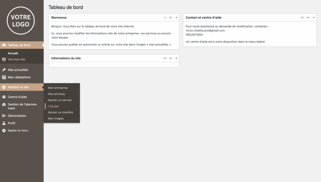 2- Dans le menu de gauche, cliquez sur “L’Équipe” en passant votre souris sur « Modifier le site »