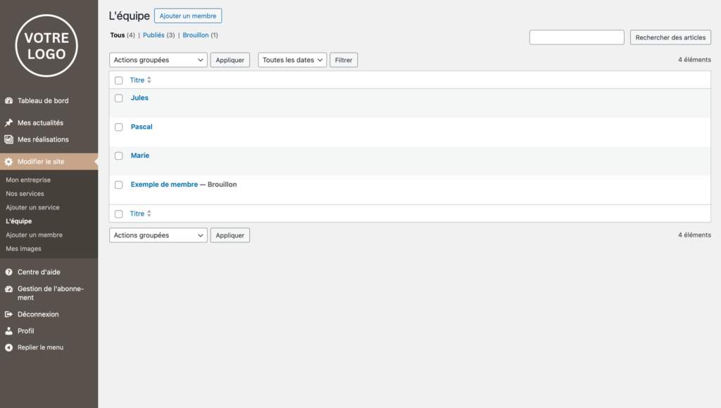3- Vous verrez la liste des membres actuellement affichés sur votre site (ici, vous pourrez ajouter, supprimer ou modifier un membre).